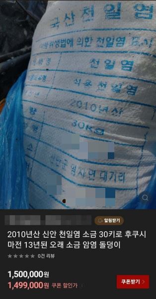 중고 거래 사이트에 따르면, 지난 20일 한 중고사이트에 '2010년산 신안 천일염 소금 30㎏을 판매한다'는 글이 올라왔다. 이 판매자는 "후쿠시마 원전 폭발 전 13년 된 오래된 소금"이라며 가격을 무려 150만원으로 책정했다.