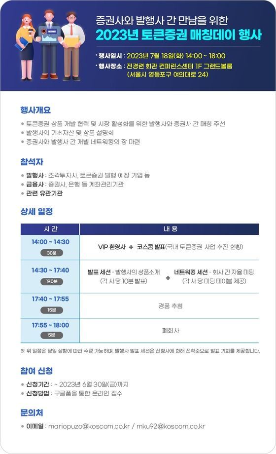 한국거래소 IT 자회사인 코스콤은 오는 7월 18일 여의도 전경련 그랜드볼룸에서 토큰증권 발행사와 유통사를 위한 '토큰증권 매칭데이' 행사를 연다고 밝혔다.