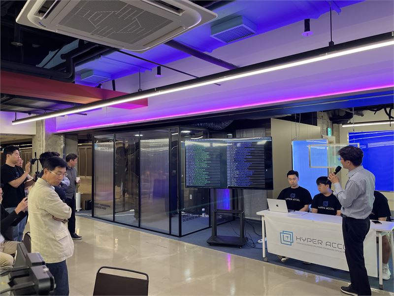 6월 28일 경기 화성시 KAIST-동탄 사이언스 허브에서 열린 한국생성AI파운데이션(KGAF) 발대식에서 김주영(오른쪽 마이크 잡은 이) (주)하이퍼엑셀 대표가 미국 엔비디아의 GPU 없이도 더 우수한 생성 AI 추론 성능을 보이는 생성 AI 가속기 서버 'HA-Orion’을 소개하고 시연을 해 보이고 있다.