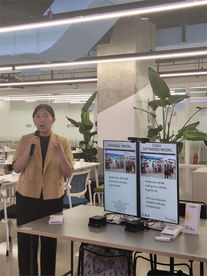 김나율 클리카 공동 대표가 6월28일 경기 화성시에서 열린 한국생성AI파운데이션 발대식에서 자사의 인공지능 자동 경량화 솔루션 '클리카'에 대해 시연을 해보이고 있다.