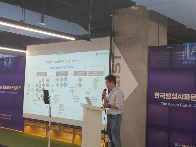 강남우 (주)나니아랩스 대표가 6월 28일 경기 화성시에서 열린 한국생성AI파운데이션 발대식 겸 포럼 행사에서 '생성AI 기반 제품 설계 및 디자인’을 주제로 자사의 주력제품아슬란 엔지니어(Aslan Engineer)와 아슬란 디자이너(Aslan Designer)의 특징과 주요 기능을 소개하고 있다.