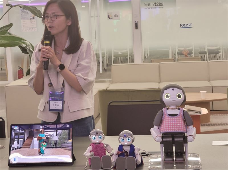 신현미 (주)마인드로 대표가 28일 경기 화성시에서 열린 한국생성AI파운데이션 발대식 겸 포럼 행사에서 ‘생성AI 로봇혁명, 생성 AI 감성 다이얼로그 멀티 모달 인터액션’을 주제로 꼬마 로봇과의 대화를 직접 시연해 보이고 있다.