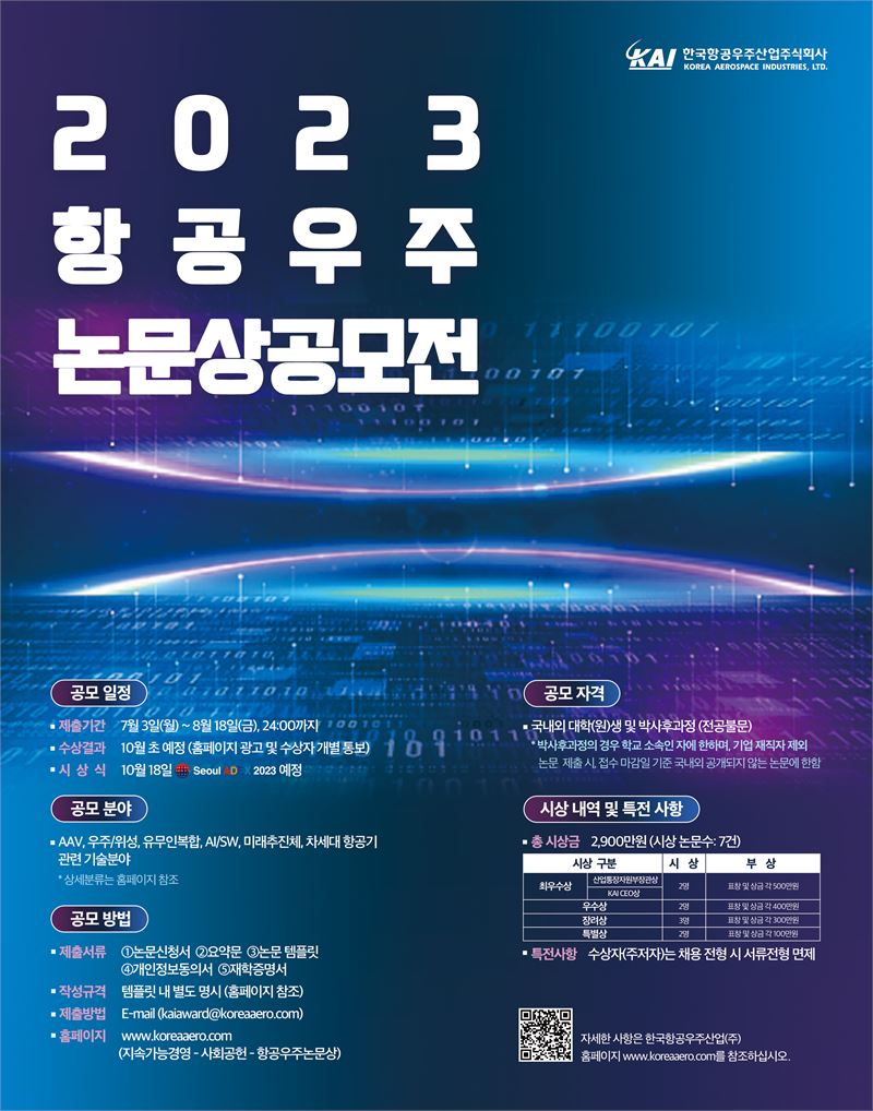 KAI(한국항공우주산업)가 항공우주산업 관련 젊은 인재들의 창의적 연구개발 활성화를 위해 ‘항공우주논문상 공모전’을 개최한다.