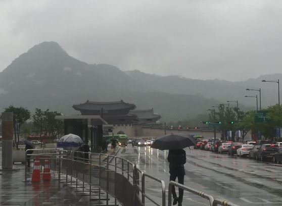 지난달 28일 오후 장맛비가 세차게 내린 광화문광장 버스정류장 모습. 정기홍 기자