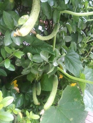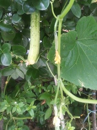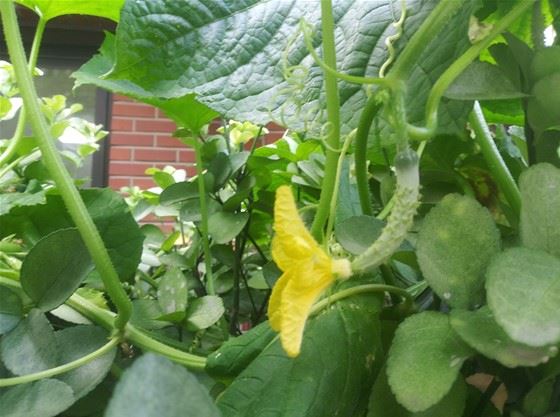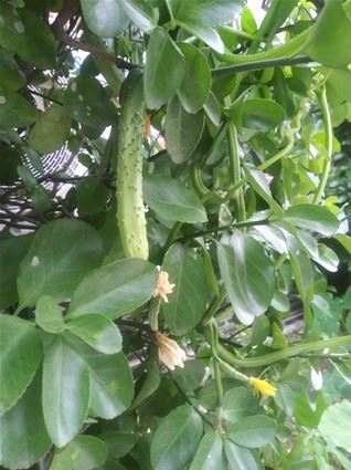 사철나무 잎 사이로 오이 줄기가 자랐고, 오이가 큼지막하게 자랐네요. 밑엔 작은 꽃이 피었고 앙증맞을 정도의 오이가 달렸습니다.