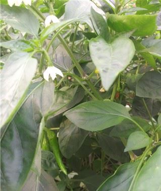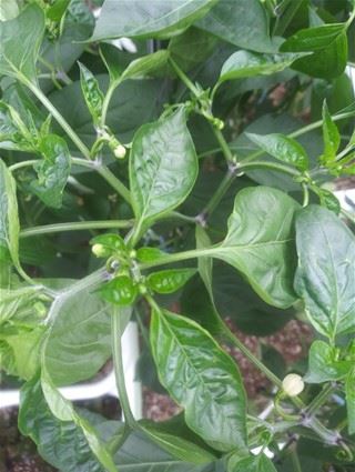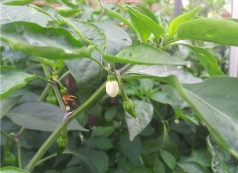 하얗게 핀 꽃과 꽃이 진 뒤 열린 작은 고추들. 길죽하지 않고 지금부터 길이를 키운다.