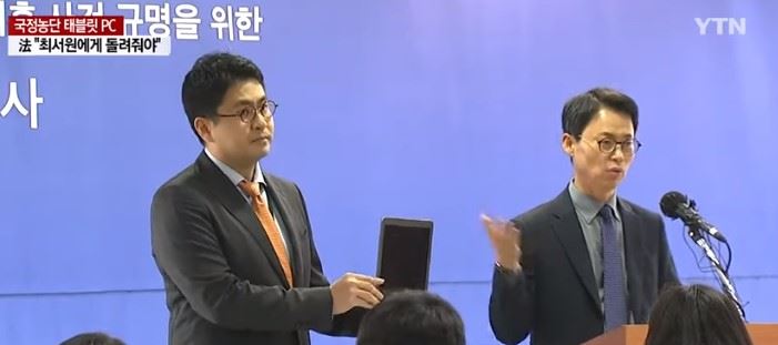 '국정농단 특검' 당시 이규철 당시 특검보가 당시 문제의 태블릿PC를 갖고 나와 브리핑을 하고 있다. YTN 뉴스 캡처