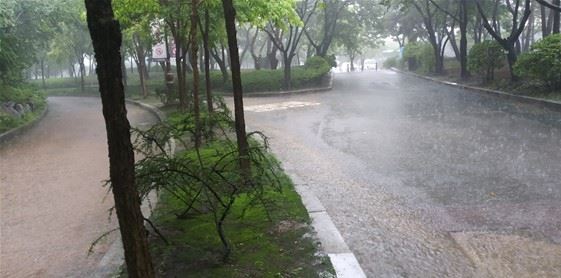 오후 3시 반쯤 비가 세차게 내리자 빗물이 고이고 있는 여의도공원 모습