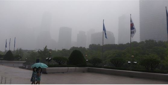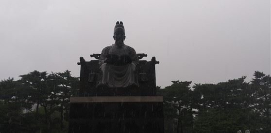 여의도공원에 있는 세종대왕 동상이 비에 흐릿해 보인다.