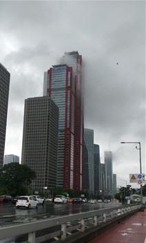비가 잠시 소강 상태를 보이면서 낮은 비구름이 '파크원' 빌딩에 걸쳐져 있다. 마포대교에서 본 여의도 모습. 파크원은 72층(333m)으로 IFC(285m), 63빌딩(249m)보다 훨씬 높다.이상 정기홍 기자