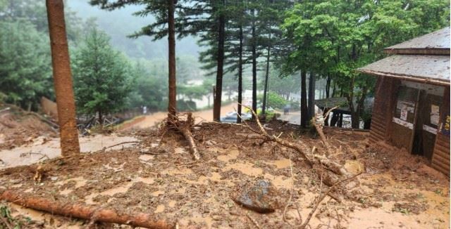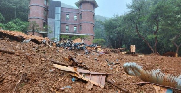 14일 호우특보가 내려진 충남 논산시 양지추모원 납골당에서 산사태가 발생, 방문객 4명이 매몰됐다가 구조됐지만 2명은 심정지 상태로 병원으로 옮겨졌다.