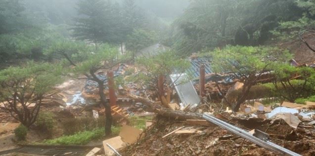 소방 당국에 따르면 이날 오후 4시 2분쯤 납골당 건물이 붕괴돼 방문객 4명이 매몰됐다는 신고가 접수됐다. 비탈면 토사가 붕괴돼 납골당 건물을 덮혔다.