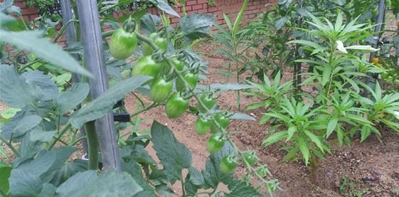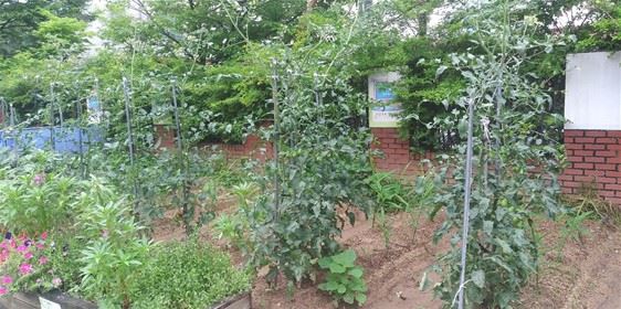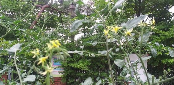 아파트 단지에 조성돼 있는 텃밭(남새밭). 한여름 뙤약볕과 빗물을 자양분으로 잘 자라고 있습니다. 지줏대로 보강한 키 튼 것이 토마토 줄기입니다. 이상 정기홍 기자