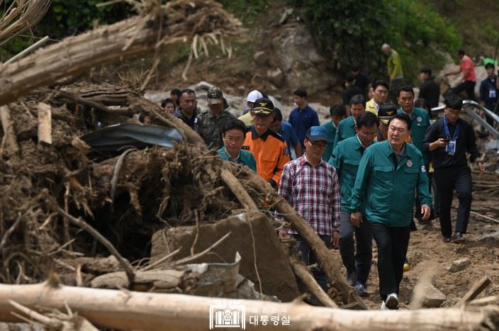 윤석열 대통령이 17일 경북 예천 산사태 현장을 방문하고 있다. 대통령실