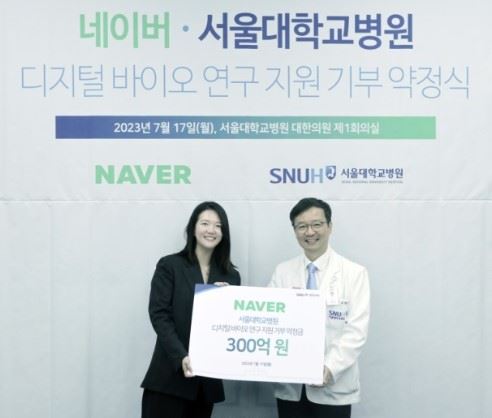 네이버가 18일 디지털바이오 분야 연구 지원을 위해 서울대병원에 3년간 300억 원을 기부하기로 약정했다. 이는 서울대병원 기부 사상 단일 연구 지원 기부액 가운데 최대다.