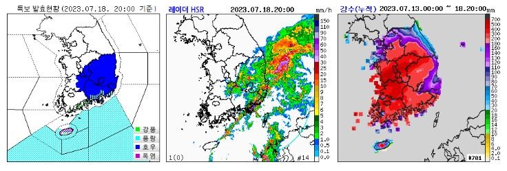 19일 아침까지 예상 비는 ▲강원남부(영월·태백·정선·삼척·동해) 5~20㎜ ▲충북남부(보은·옥천·영동)·충남남동내륙(금산) 10~60㎜ ▲충남남부(서천·부여·논산) 5㎜ 미만 ▲전북동부 20~80㎜ ▲전북서부 5~20㎜ ▲전남(장성·영광·구례·여수·광양·담양) 5㎜ 미만 ▲대구·경북·울릉도·독도·부산·울산·경남 50~120㎜(경북·부산·울산·경남 최대 180㎜ 이상) ▲제주남부·동부·산지 20~60㎜ ▲제주북부·서부 5~20㎜로 예상된다.