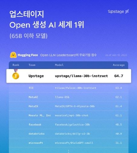 업스테이지는 19일 글로벌 AI 플랫폼인 허깅페이스가 운영하는 오픈 LLM 리더보드에서 자사 AI 모델이 이 같은 성과를 거뒀다고 밝혔다.