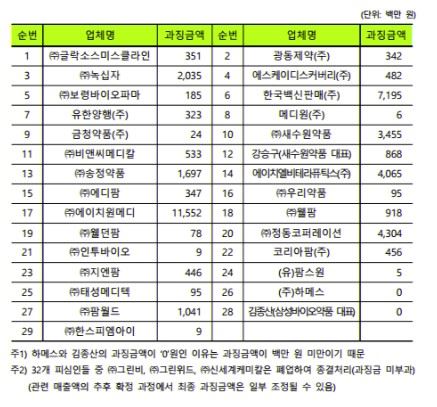 과징금은 글락소스미스클라인 3억 5100만 원, 녹십자 20억 3500만 원, 보령바이오파마 1억 8500만 원, SK디스커버리 4억 8200만 원, 유한양행 3억 2300만 원, 한국백신판매 71억 9500만 원 등이다.