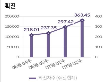 22일 중앙방역대책본부에 따르면 7월 둘째 주 신규 확진자는 총 18만 6953명으로 전주보다 22.2% 늘었다. 주간 하루 평균 확진자도 6월 셋째 주 1만 6025명에서 7월 둘째 주 2만 6708명으로 3주째 증가하고 있다.