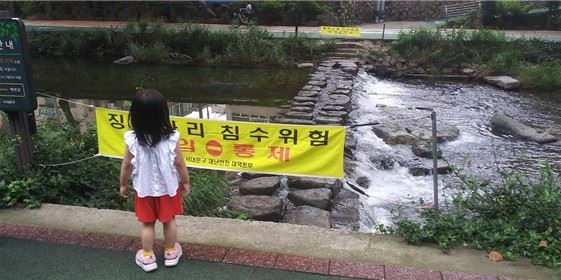 징검다리 옆에 선 어린이. 할아버지와 함께 나온 아이가 '진입금지' 작은 현수막 너머의 징검다리를 아쉬운 듯 바라보고 있네요. 징검다리를 지난 물길이 하얀 물보라를 치며 소리내 흘러갑니다. 참으로 시원합니다. 이상 정기홍 기자