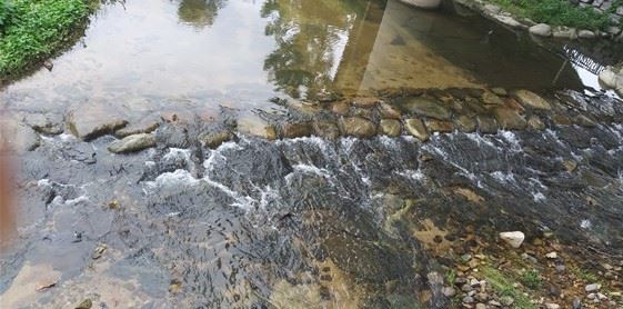 장맛비 물이 작은 보 역할을 하는 물 가둠 둑을 넘쳐서 흐르고 있는 모습