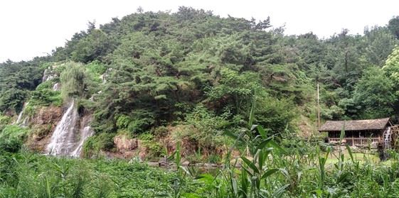 인공폭포 오른쪽, 물레방아를 돌리며 흘러내리는 물도 한여름 운치를 더해주고 있다.