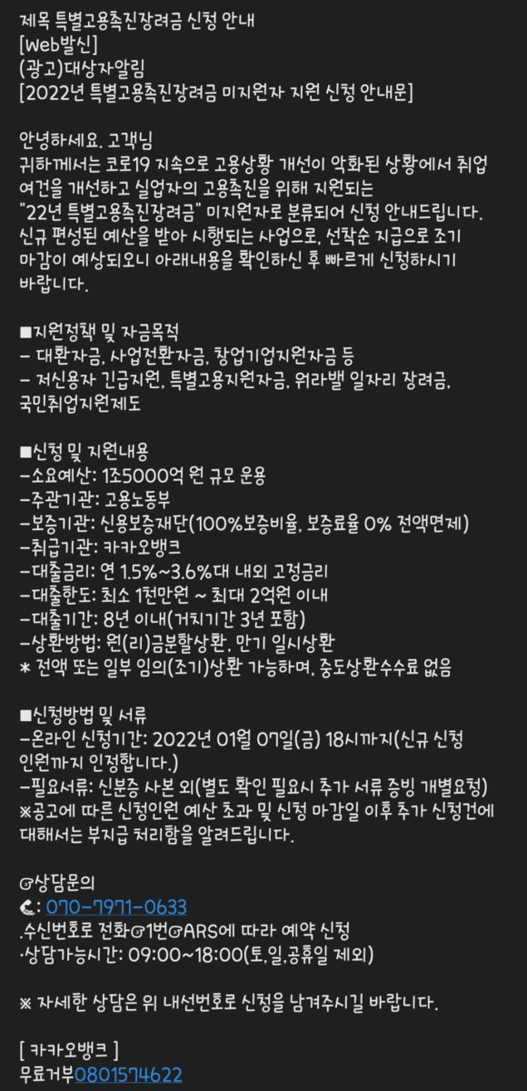 2분기 피싱 문자 중 가장 많았던 정부지원금 위장 문자는 ▲‘정부에서 지원하는 대출 상품에 선정돼 저금리, 고정금리 같은 좋은 조건으로 대출이 가능하다’ ▲‘신종 코로나바이러스 감염증(코로나19)으로 피해를 받은 소상공인이나 영세사업주에게 새출발기금을 지원한다’는 등의 내용을 담고 있었다.