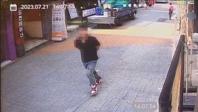 21일 오후 서울 지하철 2호선 신림역 부근에서 시민들에게 무차별 칼부림을 한 30대 남성 조 모 씨가 칼을 손 뒤로 들고 어딘가로 뛰어가고 있다. CCTV