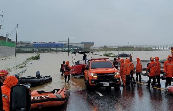 지난 7월 15일 미호천 범람으로 침수된 충북 청주시 흥덕구 오송읍 궁평 제2지하차도에서 소방대원들이 구조활동을 벌이고 있다. 충북소방본부 제공