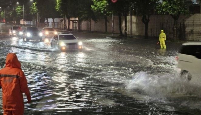 7월 18일 오후 부산 사하구 사하경찰서 앞 도로가 침수된 모습. 부산에는 4일째 호우경보가 내려졌다. 부산소방재난본부 제공