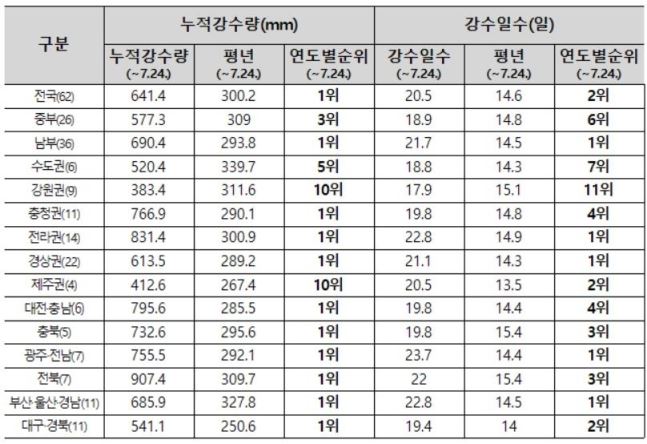 25일 기상청에 따르면 올해 장마가 시작된 지난달 25일부터 24일까지 전국 평균 누적 강수량은 641.4㎜였다. 장마 시종(始終)일은 약간 다르지만 지난 1973년 이후 장마철 전국 평균 강수량 중 3위다.