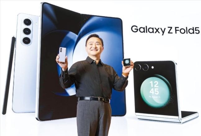노태문 삼성전자 모바일경험(MX)사업부장(사장)이 26일 서울 삼성동 코엑스에서 열린 '갤럭시 언팩 2023' 행사에서 스마트폰 '갤럭시 Z 플립5'와 '갤럭시 Z 폴드5'를 소개하고 있다. 삼성전자 제공