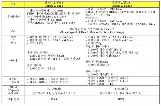 접히는 '갤럭시 Z 플립5'의 경우 커버 디스플레이의 크기가 기존 1.9인치에서 3.4인치로 두 배나 커졌다. 무게는 이전 제품보다 2g 가벼워진 185g이다.