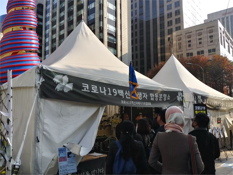 서울 중구 청계천 입구에 있는 코로나19 백신 희생자 합동분향소. 정기홍 기자