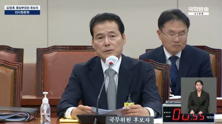 김영호 통일부 장관이 지난 21일 국회 인사청문회에서 의원들의 질문에 답변하고 있다. 국회방송 중계 캡처