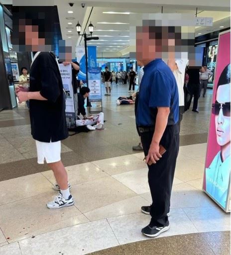 3일 오후 경기 성남시 분당 지하철 서현역사에서 발생한 칼부림 난동으로 피를 흘린채 쓰러져 있는 시민을 시민들과 119대원이 응급처치를 하고 있다. 독자 제공