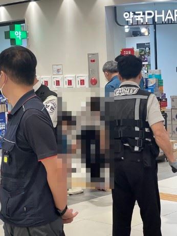 4일 오전 서울 서초구 강남고속터미널 지하상가에서 경찰이 20대 남성 A 씨를 체포 중이다. 독자 제공