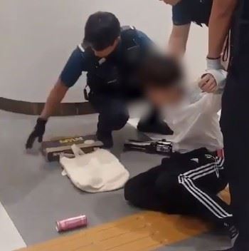 4일 오전 서울 서초구 강남고속터미널에서 흉기를 소지한 20대 남성을 경찰이 체포하고 있다. 온라인 커뮤니티