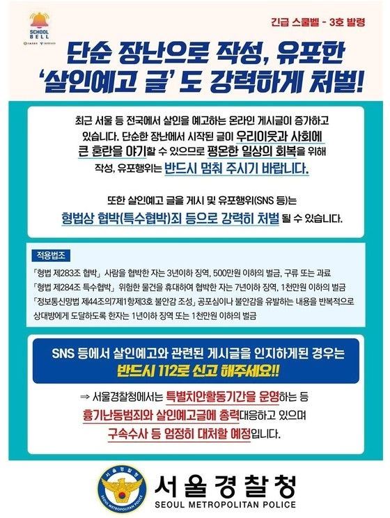 서울경찰청은 최근 발생하는 살인 예고 글 게시·유포를 선제적으로 차단하기 위해 서울 시내 전역 초·중·고등학교 1407개와 학부모 83만명을 대상으로 '긴급 스쿨벨 3호'를 발령한다고 7일 밝혔다.