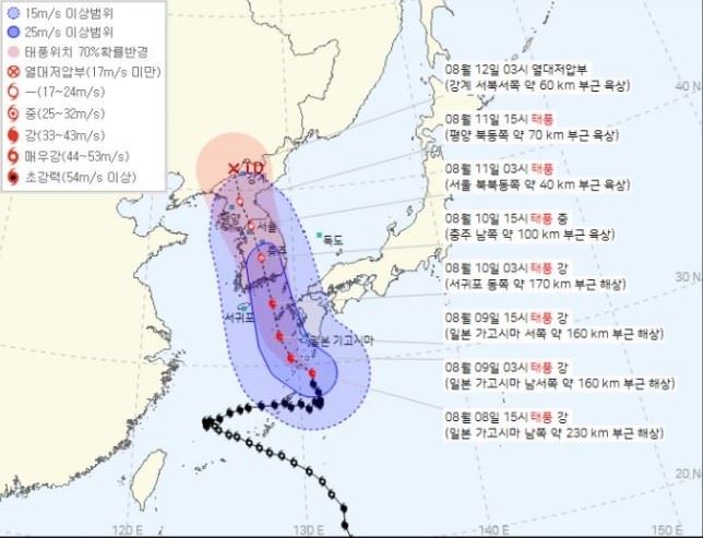한반도는 9일부터 태풍 영향권에 들어 이날 밤부터 전국에 걸쳐 비가 내린다. 비는 다음날인 10일까지 이어진다.
