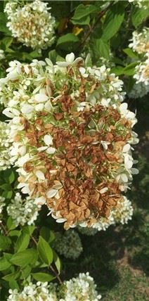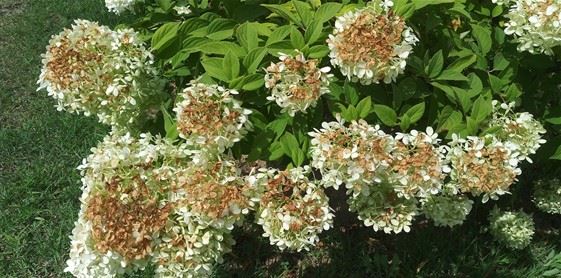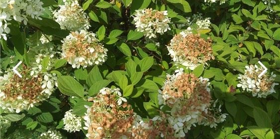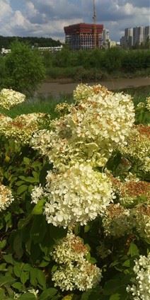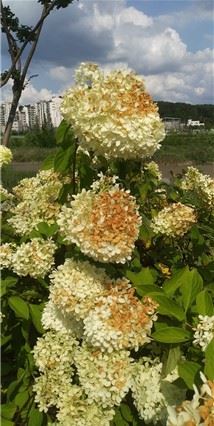 보름째 지속된 폭염 속 햇살에 복실복실하던 하얀 수국꽃 윗부분이 타들었네요.