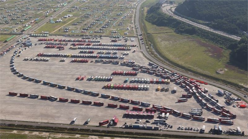 태풍 '카눈' 북상에 따라 8일 오전 전북 부안군 2023 새만금 세계스카우트잼버리 야영지 대원들을 태우고 이동할 1000여 대의 버스가 줄지어 있다. 행정안전부 제공