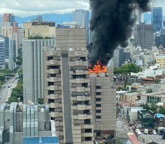 24일 낮 서울 강남구 신논현동 르메르디앙호텔(옛 리츠칼튼호텔) 옥상에서 큰 화재가 발생했다. 디행히 인명 피해는 없었다.