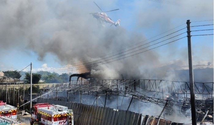 소방 헬기가 25일 오전 경기 화성시 향남읍 구문천리 한 폐기물 업체에서 난 불을 진화하고 있다. 경기도소방재난본부 제공