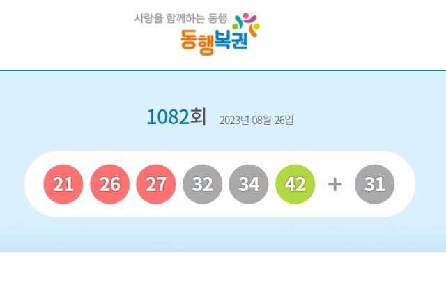 26일 제1082회 동행복권 로또 추첨 결과 ‘21, 26, 27, 32, 34, 42’가 1등 당첨 번호로 결정됐다. 2등 보너스 번호는 ‘31’이다.