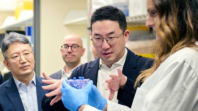 구광모 LG그룹 회장은 21일(현지시간) 미국 보스턴의 다나파버를 방문해 세포치료제 생산에서 항암 기능을 강화시킨 세포를 선별하는 과정에 대한 설명을 듣고 있다. (LG제공)