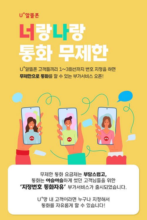 3일 LG유플러스에 따르면 '지정번호 통화자유 서비스'는 U+망 알뜰폰 가입 고객이 지정한 번호와 무제한으로 음성통화를 할 수 있는 서비스다.