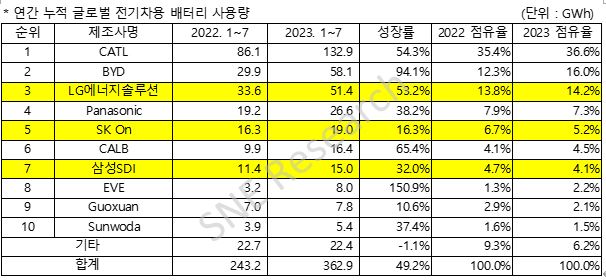 SK온은 점유율 5.2%로 5위, 삼성SDI는 점유율 4.1%로 7위였다. 두 회사는 점유율에서는 전년보다 각각 1.5%p, 0.6%p 하락했다.