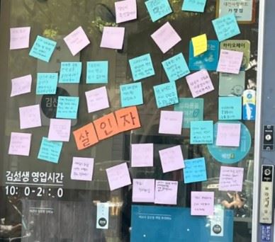 해당 김밥집 입구의 문에 ‘살인자’ 등 비난 글의 포스트잇(쪽지)이 가득 붙어 있다. 계란과 밀가루를 투척하기도 했다. 보배드림