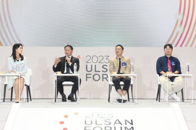 최태원(왼쪽에서 두번째) SK그룹 회장이 지난 14일 울산전시컨벤션센터에서 열린 '2023 울산포럼' 폐회식에서 질문에 답하고 있다. SK이노베이션 제공